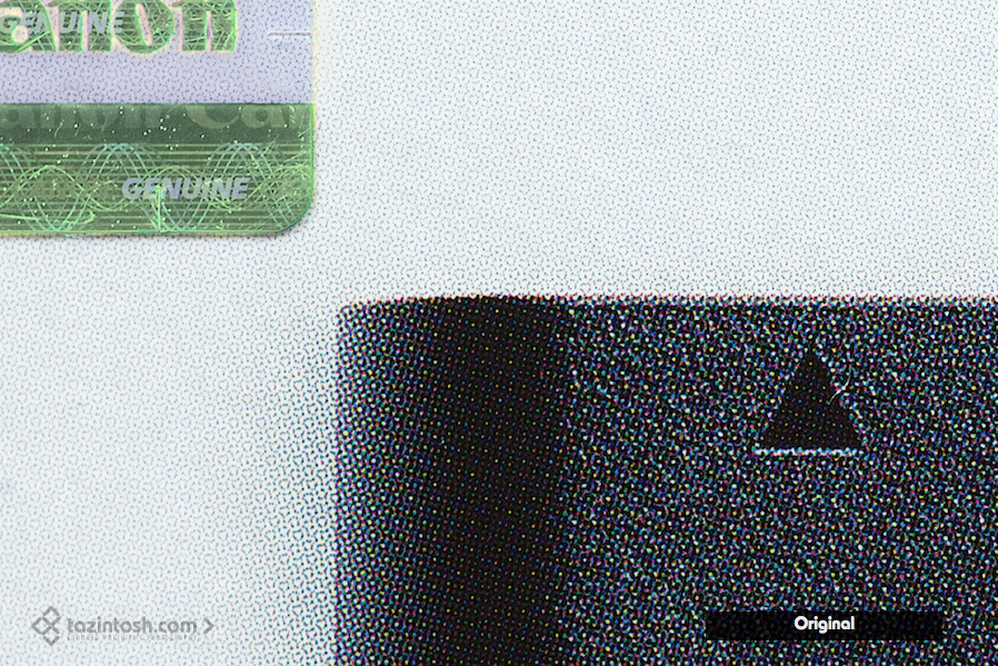 On peut clairement voir la différence de qualité du visuel de la batterie et de son ombre portée. La variation de teinte du fond blanc s'explique par la trame d'impression. À noter que si les deux photos semblent avoir un hologramme très différent, d'un simple regard à taille réelle (≈ 1 cm), la distinction est impossible. En effet, la prise de lumière de l'hologramme est quasi identique en manipulant les boîtes. Sur photo, ce n'est pas aussi simple et j'ai retouché l'hologramme original pour révéler davantage de détails. En gros plan, la qualité de l'hologramme Canon est nettement supérieure. P.-S. : l'hologramme Canon de la troisième batterie reçue est différent.