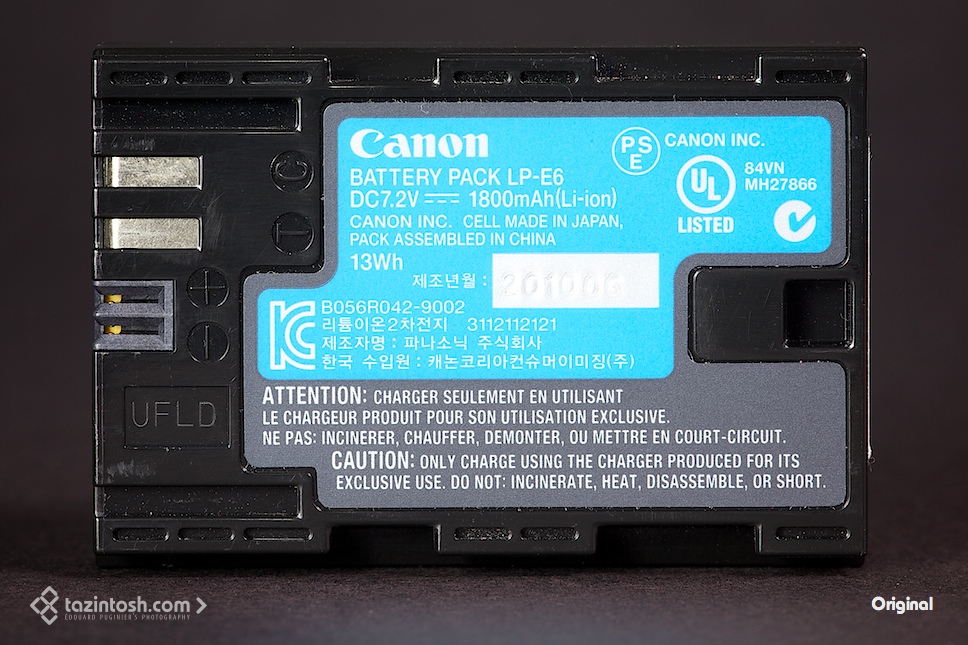 Il y a une vingtaine de jours, j'ai commandé un sixième exemplaire afin de prévoir, entre autres, un prochain voyage au Népal. La batterie alors reçu avait un « touché » différent que j'ai immédiatement remarqué mais étant donné que Canon signale noir sur blanc dans la notice que « les caractéristiques techniques et l'aspect physique du produit sont sujets à modification sans préavis », j'ai considéré cela probable ; d'autant plus que la batterie était dans ses emballages, notice, capuchon… bref, tout complet. Placée dans mon 5D Mark II ou 7D, elle se « déclarait » même en tant que LP-E6, avec numéro de série.