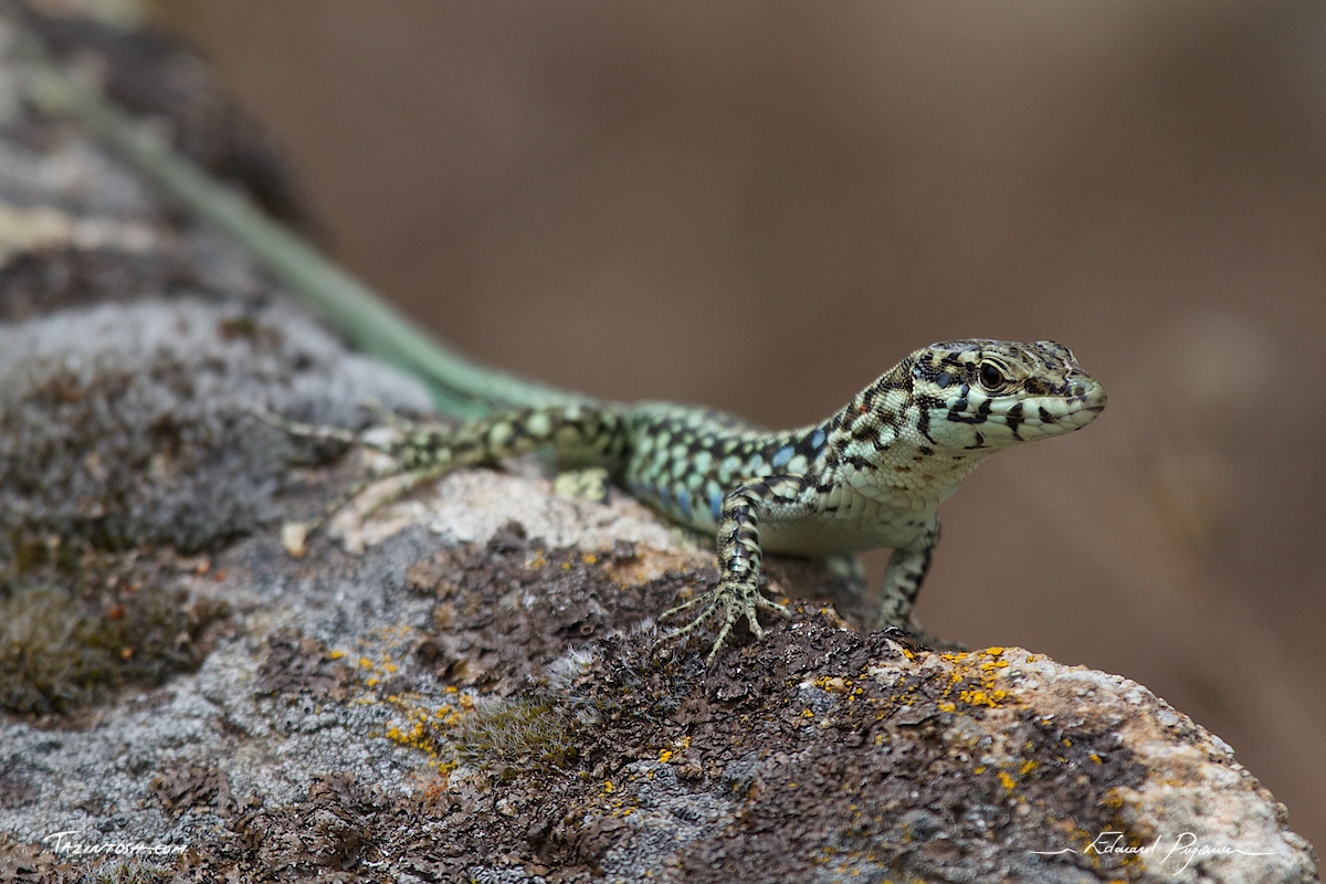 The common wall lizard is a small, thin lizard whose small scales are highly variable in colour and pattern. Its coloration is generally brownish or greyish, and may occasionally be tinged with green. In some individuals, the row of spots along their backs may form a line, while others may have a reticulated pattern with dark spots on the side and scattered white spots that can be blue in the shoulder region. The tail is brown, grey or rust in colour, and may also have light bars on the sides. The belly region has six rows of larger rectangular scales that are generally reddish, pink, or orangish. Common wall lizards may also have dark markings on the throat. This lizard has six distinct morphological forms which are identified by the colouration of its throat and underbelly. Three of these are pure morphs consisting only of solid colours on their scales: white, red (orange) or yellow, and three other morphs are distinguished by a combination of colours: white-yellow, white-red and yellow-red.[5]