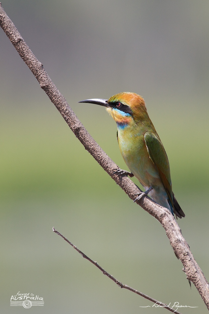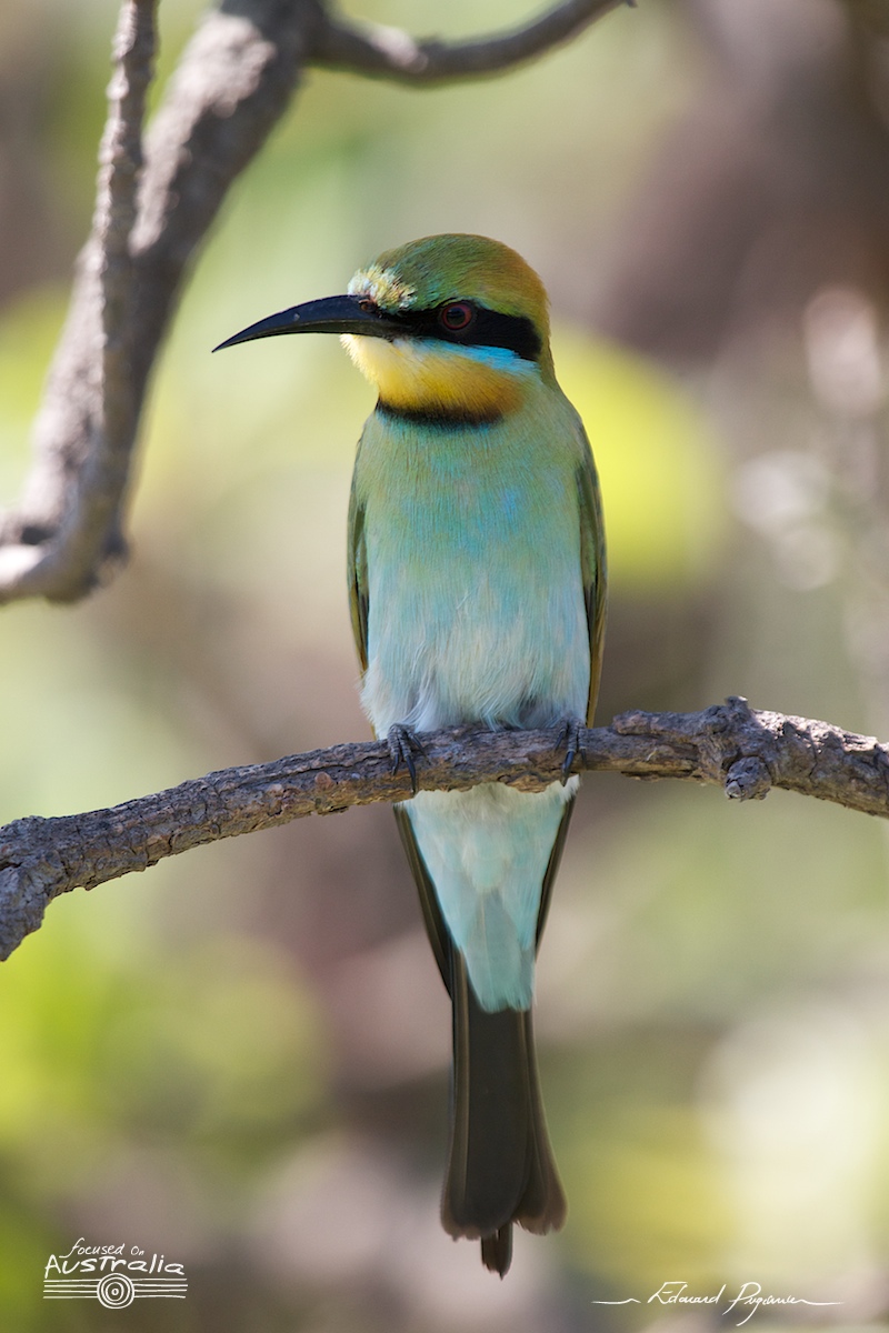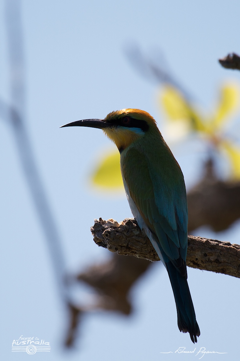 Ce sont des oiseaux aux couleurs brillantes qui peuvent mesurer de 20 à 25 cm de longueur, y compris les plumes de la queue. La partie supérieure du dos et les ailes sont de couleur verte, le bas du dos et le dessous de la queue sont bleu vif. Le dessous des ailes et les plumes de vol primaires sont rouge avec le bout noir, la queue est noire à violet foncé. Les deux plumes centrales de la queue sont plus longues que les autres, et sont plus longues chez la femelle que chez le mâle. La couronne de la tête, le ventre, la poitrine et la gorge sont jaune pâle et elle a une bavette noire ainsi qu'une bande noire à travers ses yeux rouges.
