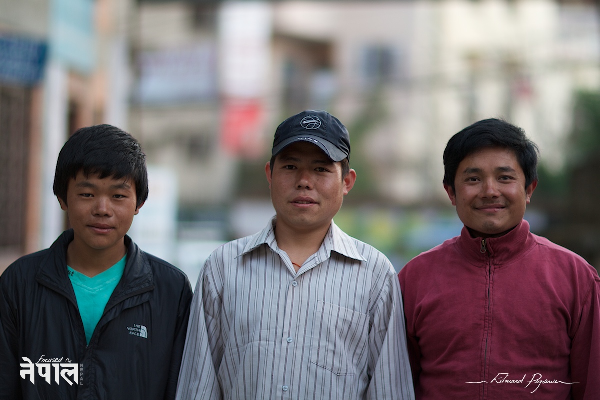 Tous de la même famille, Ira (Rai), Samser (Rai) et Kaji (Rai) nous ont accompagnés durant 10 jours de trek. À sept, c'est une grande famille que nous sommes devenus, et je dois avouer que l'attachement s'est fait rapidement, même si notre culture semble plus expressive à ce niveau. Kaji était notre guide et traducteur (anglais / français), de chez Parfums d'Aventure, Ira et Samser nos porteurs. Ira nous a fait réfléchir à deux fois sur notre prétendue forme physique et les besoins « d'équipement » tant il était impressionnant avec « rien ». J'ai vraiment apprécié le côté responsable et posé de Samser qui en plus, était toujours à mes côtés pour la photographie. Kaji a superbement géré le trek et nous à appris beaucoup. Nous gardons un merveilleux souvenir d'eux, de nos journées et soirées partagées, autour d'un apéritif que nous faisions, autour d'un repas qu'ils nous concoctaient.