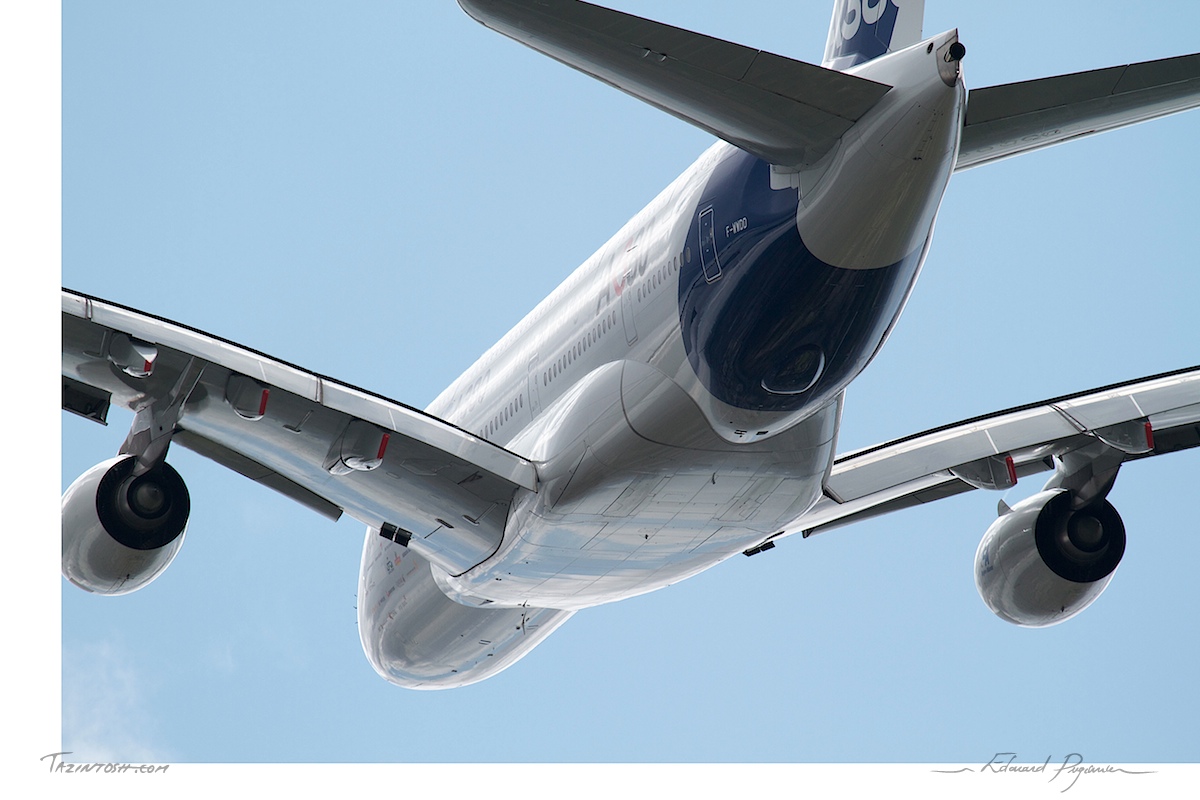 Probablement ma préférée de tous mes clichés sur cette édition 2011 du Salon du Bourget. Cet avion, de part sa taille si imposante et ces passages basse altitude, prend la lumière d'une merveilleuse façon. Cette photo n'a pas été recadrée et j'ai volontairement visé plein zoom (400 mm — équiv. 640 mm sur le 7D).