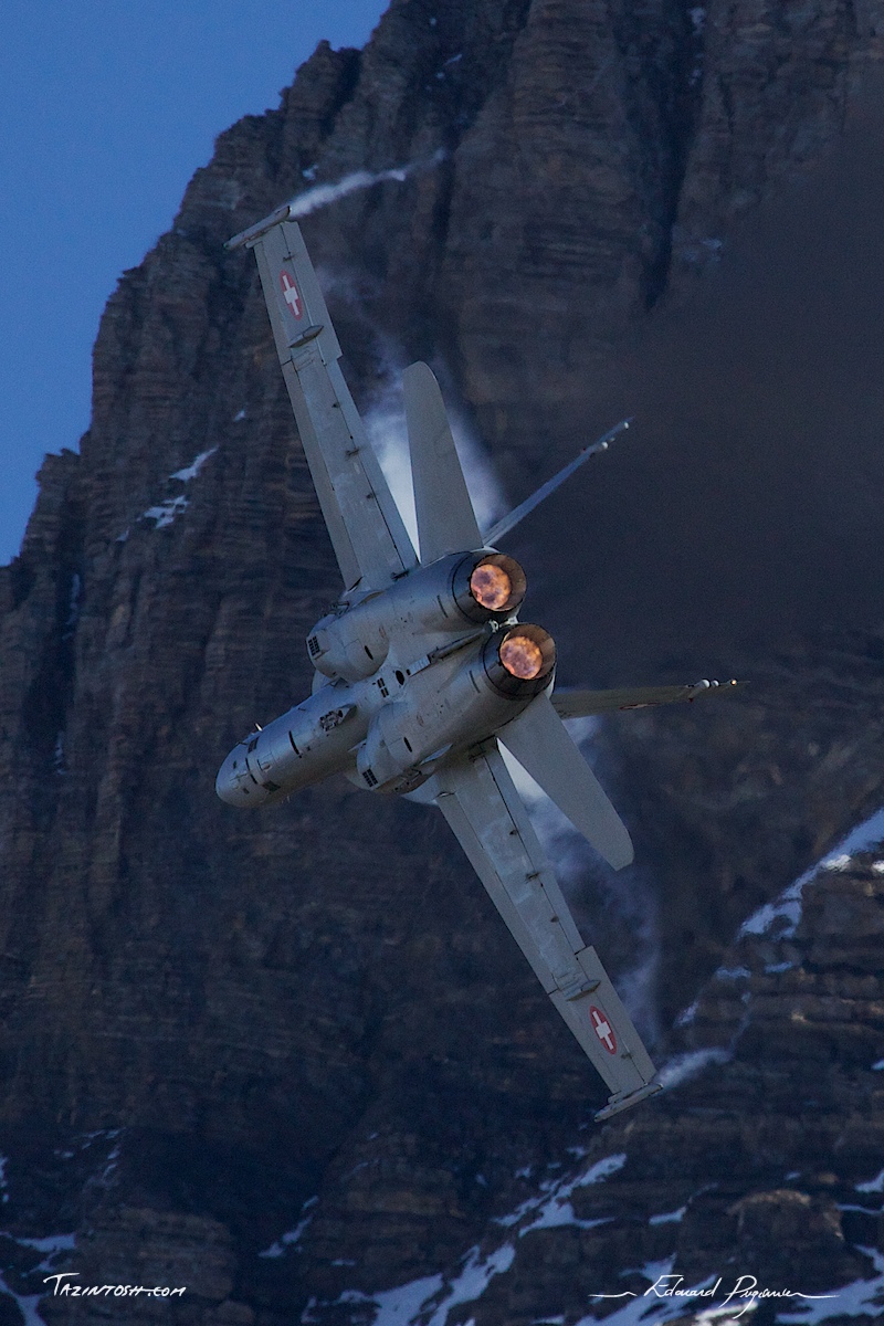 Un petit retour à l'aéronautique, ça faisait longtemps… (bougez pas, le salon du Bourget arrive ^^). À l'œuvre ici, un coucou comme la Suisse, ma fois, aime à en posséder plus de 30 :) Trêve de plaisanteries, c'est là une sacrée machine à voir évoluer, je vous le garanti. Et tellement fabuleux dans cet endroit unique qu'est l'Axalp ! Traitement obligatoire pour ce recadrage de cliché qui était sous-exposé. Augmentation de l'exposition donc, mais réduction du bruit, un poil d'accentuation, et j'ai mis deux gouttes d'alcool à brûler au cul des réacteurs histoire de détendre, pardon, réchauffer l'atmosphère.