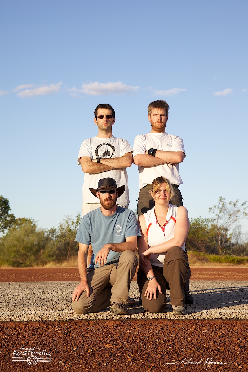 My Beloved Team 19 juillet 2013 Australia • Photography Before|After ComparisonCanon EF 100-400mm f/4.5-5.6L IS USMCanon EOS 5D Mark II Share Twitter Facebook Pinterest Tumblr Google+ Here is the small team of our previous trip to Australia. Small, but the most wonderful, with Lionel and Yannick, friends that should all just be my brothers. Starting from the bottom, left to right: Yannick, Marion, Lionel and me.