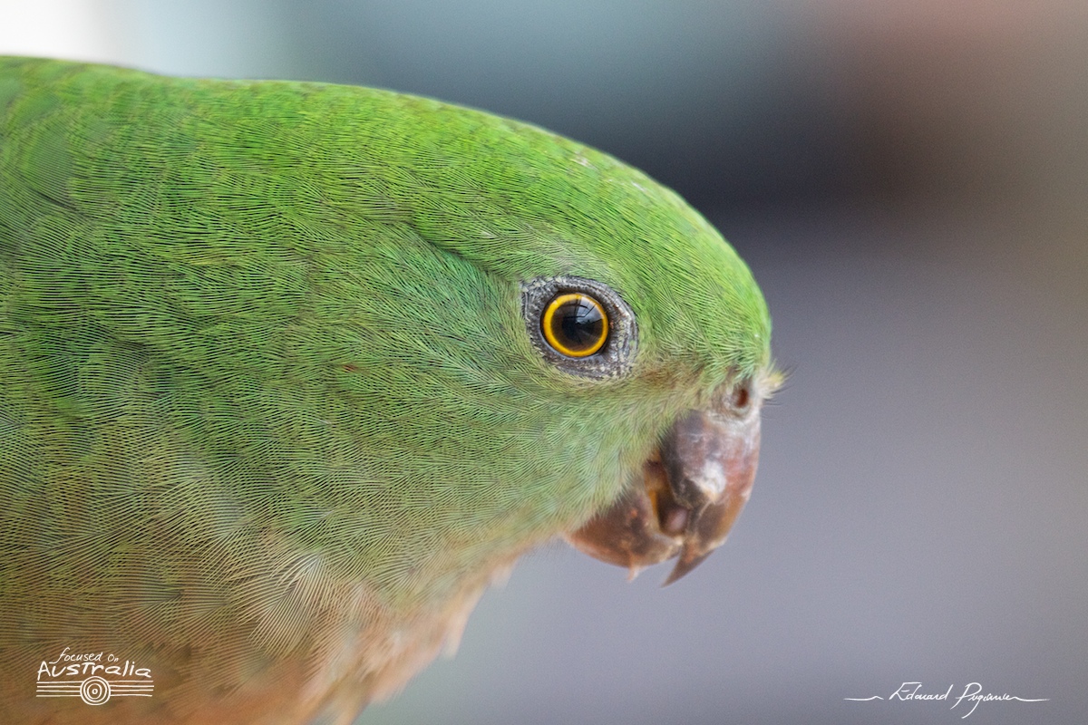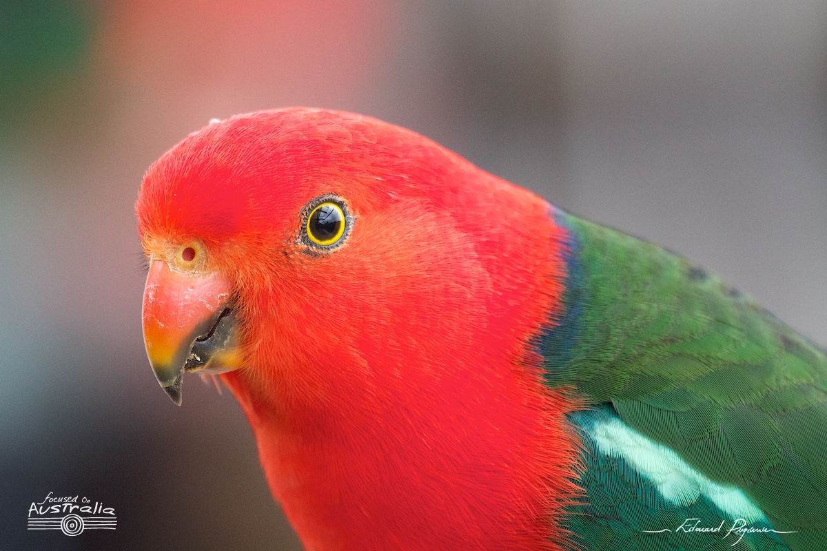 Ce couple de perruches royales (espèce endémique d'Australie) était en pleine liberté, mais comme nous étions sous un auvent au départ du Scenic Railway des Blue Mountains (position GPS), les yeux des perruches en reflétaient la présence. J'ai donc effacé ces reflets trop « urbains » en re-dessinant une partie des yeux. Ainsi, les deux oiseaux ne semblent pas enfermés, d'autant que ce n'était justement pas le cas, même si malheureusement semi-apprivoisés avec de la nourriture à « volonté » pour ravir Le Touriste…