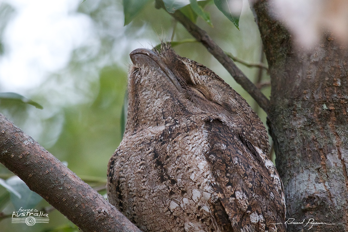 “Thank you sooooo much, really!” Voici ce que je dit au garde qui, me voyant me balader de bon matin appareil et 100-400L en main, m'interpela pour me demander si j'avais vu les frogmouth et me les fit découvrir. Lui ayant répondu “Frogmouth??? What's that?”, il m'accompagna devant un massif d'arbres fins, à quelques mètres d'où je me trouvais et se planta là en me disant : “Here.”