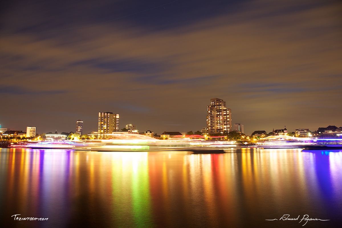 Une photo de 3 minutes de pose prise quelques instants avant le début du feu d'artifice de Cologne « Kölner Lichter Musical Fireworks ». De nombreux bateaux illuminés naviguent sur le Rhin à faible vitesse, sous le regard de plusieurs milliers de personnes.