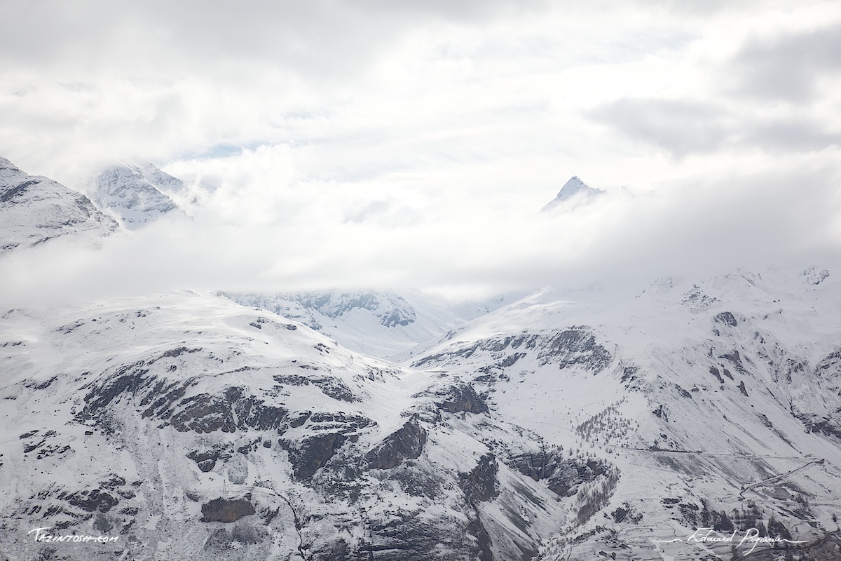Ce matin là, je luttais pas après pas pour m'arracher de la neige avec mes 18kg de sac photo, puis, m'arrêtant un instant pour me reposer, ce panorama s'offrait à mes yeux. C'était saisissant. Ci-dessous, deux traitements dont le premier, fidèle à mes « habitudes de réalité » ; le second, que j'ai beaucoup apprécié à réaliser et appelé « épique ».